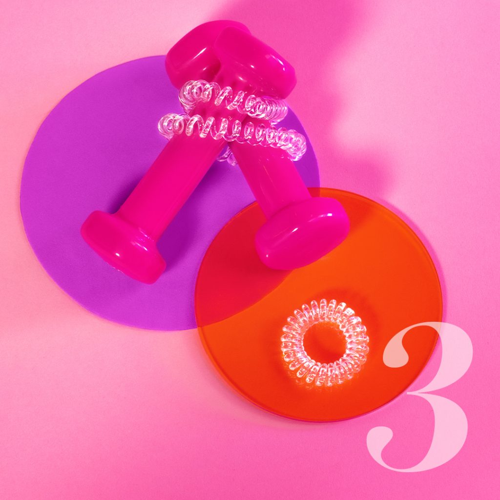 N’importe ce que vous fassiez, pensez à vos cheveux ! C’est déterminant. Pour ce qui est des mèches qui pendent, il y a une règle à respecter absolument : éviter qu’elles retombent sur le visage. Les options pour cela : faites un chignon, une queue de cheval ou une natte. Quel que soit votre choix, un chouchou maintient tout bien en place. Achetez celui d’Invisibobble Original pour en avoir immédiatement trois. Après le sport, il s’enlève vite et facilement. L’élastique répartit la pression sur les cheveux, ne laissant ni pli ni marque.