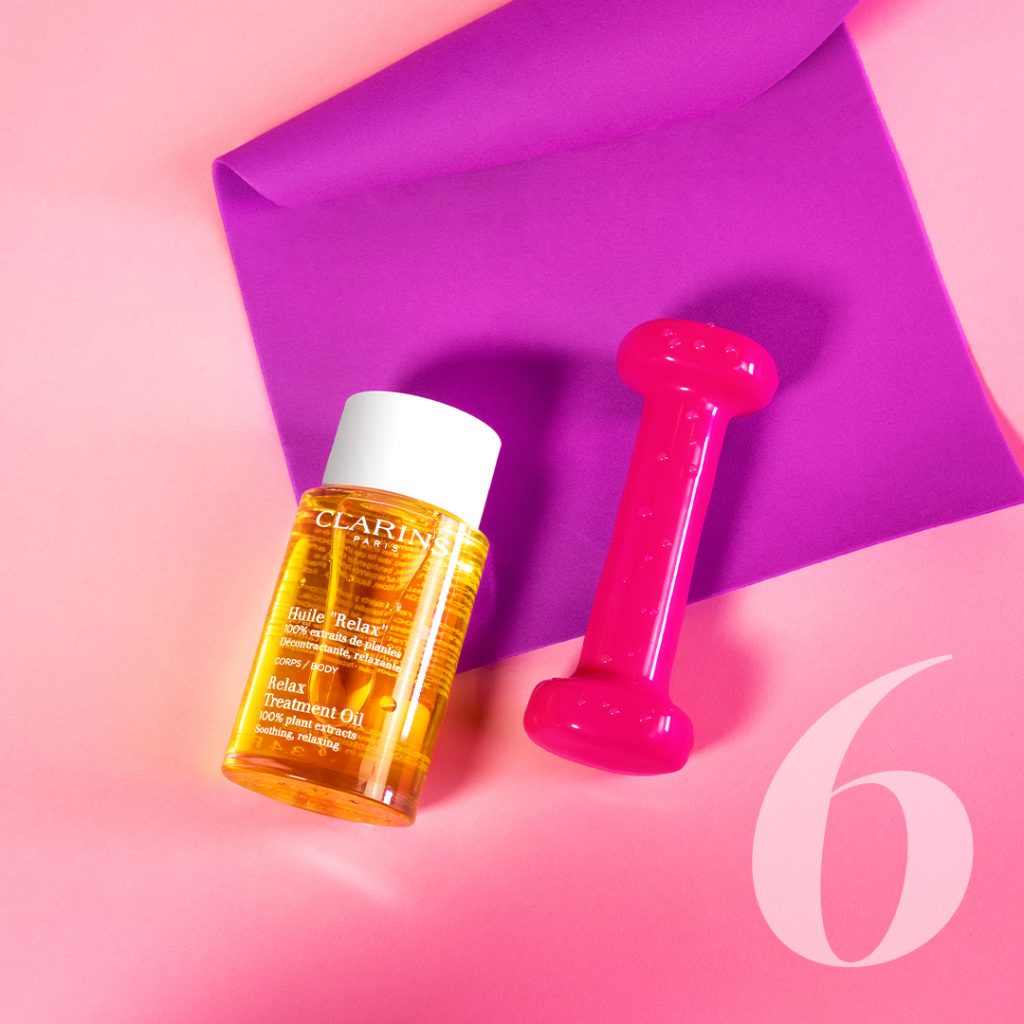 Et maintenant, le moment est venu de vous détendre vraiment et de profiter d’un moment de relaxation bien mérité. Un conseil : ayez toujours un flacon d’huile de massage à la maison. L’huile Body Treatment Oil de Clarins possède différents bienfaits. Non seulement elle hydrate la peau, mais elle a aussi un effet relaxant. Adieu stress et fatigue. Et maintenant, il reste à savoir qui va vous masser avec cette huile ? 😉