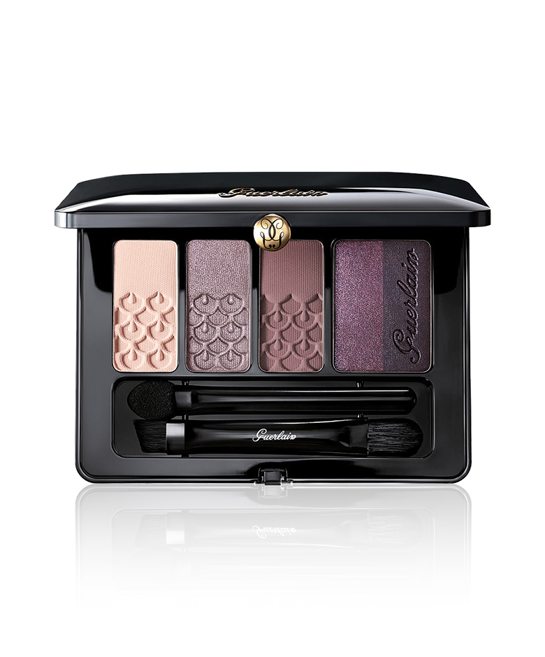 Avec la Palette 5 Couleurs '01 Rose Barbare' de Guerlain, vous avez (presque) toutes les couleurs en une. Utilisez le mauve clair sur toute la paupière mobile et appliquez un peu de mauve foncé (la deuxième nuance en partant de la droite) dans les coins extérieurs des yeux. Au ras des cils inférieurs, appliquez la nuance taupe centrale. Et estompez bien le tout!