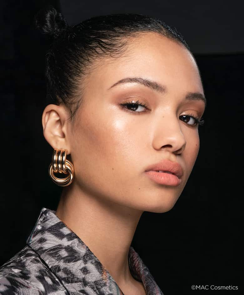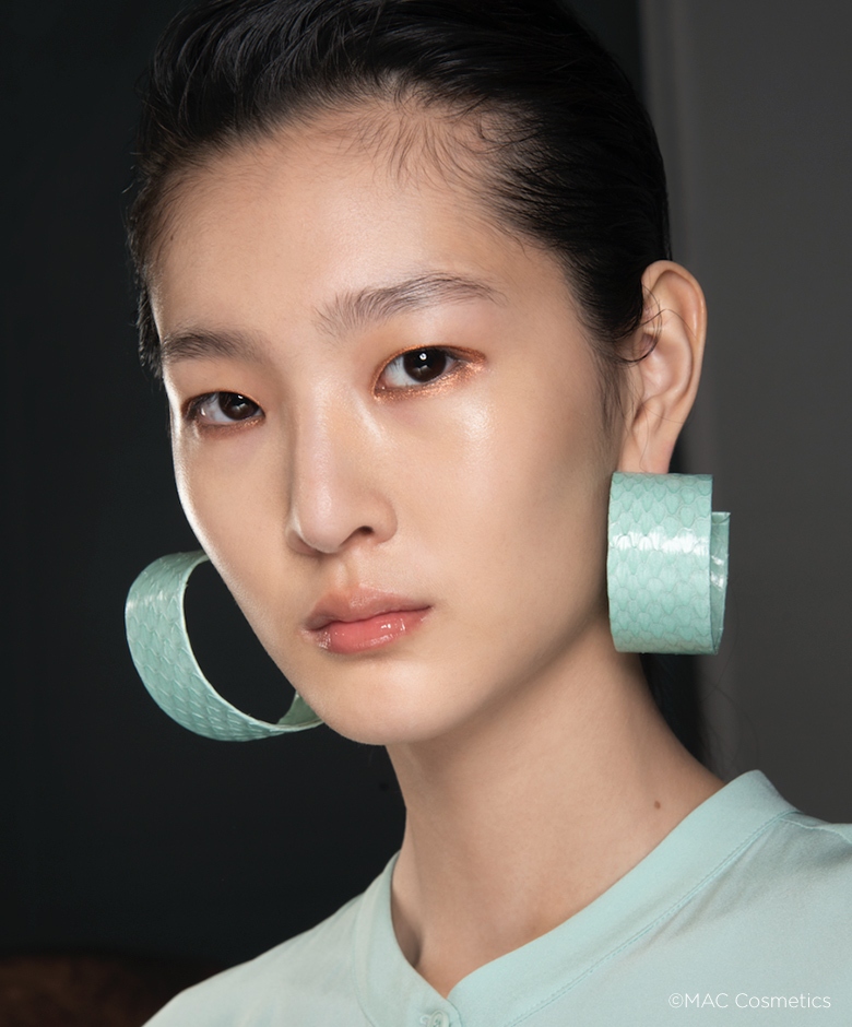 Naast de felle kleuren zagen we ook veel natuurlijke tinten bij de AW 20/21 shows. Zoals in deze zwoele look van Kim Shui! Wil je ook voor zo’n mono make-up look gaan in aardekleuren? Combineer een bruine blush zoals Blush ‘008 Blooming’ van BE Creative Make Up met een aardekleurige oogschaduw uit het Art Library Eye Palette van M.A.C.
