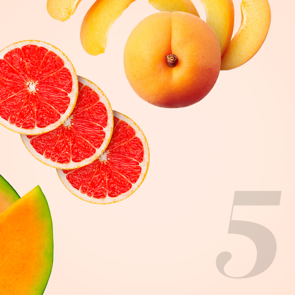 Groenten en gele of oranje vruchten zitten bomvol bètacaroteen. Dat is een kleurstof (aangeduid met E160) die het lichaam kan omzetten naar vitamine A. Je vindt deze bijvoorbeeld in wortels, abrikozen, grapefruits, cantaloupe meloenen en zoete aardappelen. Vitamine A draagt bij tot het herstellen en vernieuwen van de huid, met een egale, stralende teint als resultaat. En mooi meegenomen: het beschermt ook tegen UV-straling. Hou er wel rekening mee dat een SPF onvervangbaar is, dus blijf vooral ook smeren!