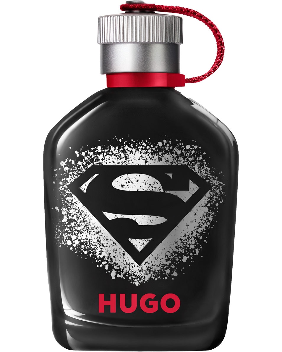 De SUPERMAN x HUGO flacon komt onverwacht uit de hoek met een design waarop Supermans iconische S-schild prijkt, dit keer verfraaid met een metallic spat-effect op doorschijnend, glanzend zwart glas. De afbeelding van een vliegende Superman op de achterzijde maakt van de flacon een waar verzamelobject, dat ook dit keer is afgewerkt met de kenmerkende HUGO-elementen: een zilveren dop en een rode band.